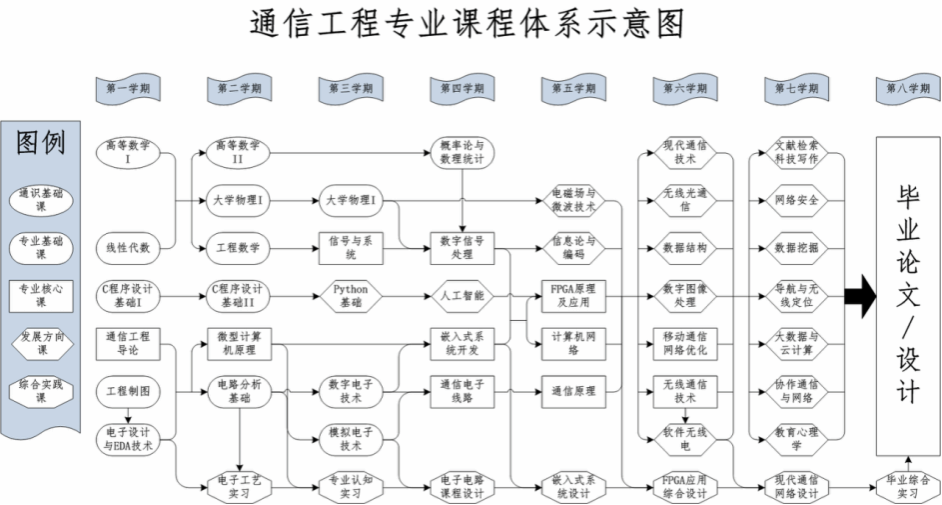 主要专业课程:高等数学、线性代数、大学物理、工程数学、概率论与数理统计、C 程序设计基础、电路分析基础、信号与系统、数字信号处理、通信原理、数字电子技术、通信电子线路、移动通信与网络优化等。