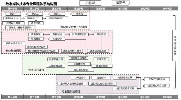 数字媒体技术专业是数字技术和艺术的结合,是计算机科学与技术大类下设置的一个新兴的交叉本科专业。因此课程体系设计思路包括以下几点:(1)夯实专业基础、凸显计算机类课程特色;(2)体现行业需求,突出办学特色;(3)注重实践,体现数字技术前沿。